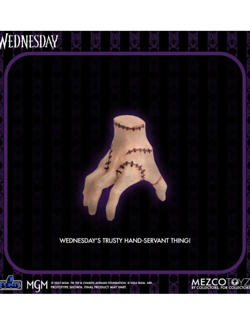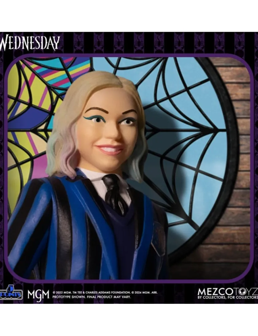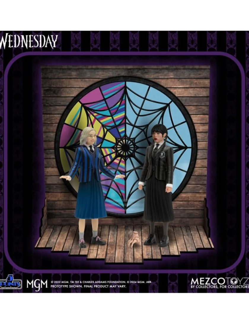 Mercoledì e Enid tratte da Wednesday (Mercoledì) entrano nella line-up Mezco 5 Points, azione completa alte 9.5cm. Vengono fornite con mani intercambiabili, braccia intercambiabili, 2 ombrelli, zaino, Mano e sfondo del Dormitorio della sala Ofelia