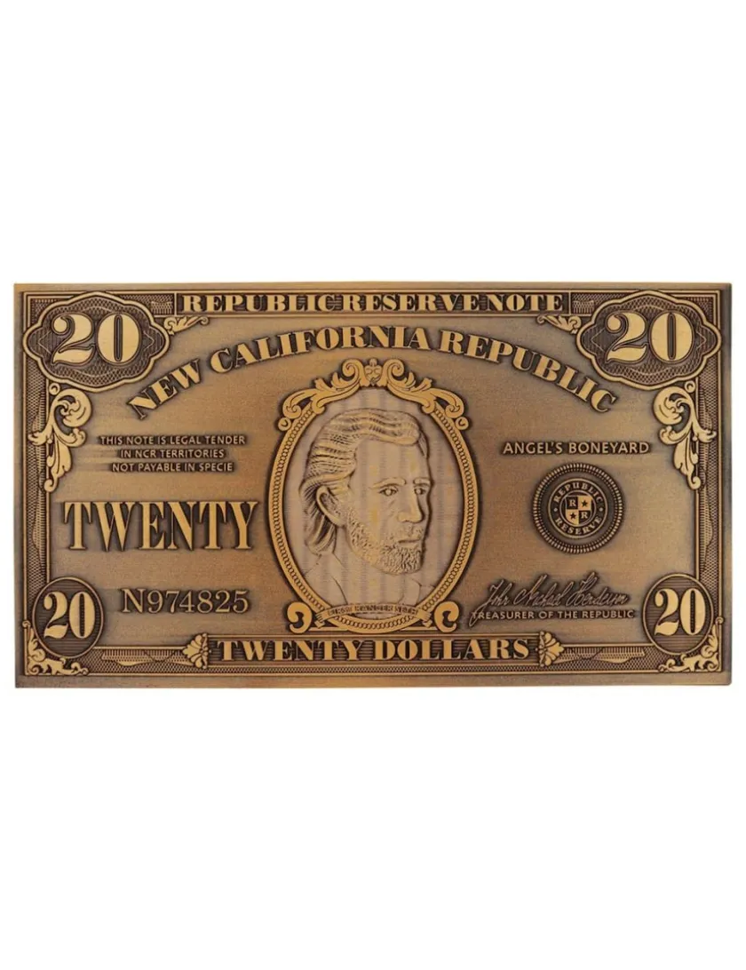 La Nuova Repubblica della California continua a vivere! Questo impero mercantile ha fondato la propria valuta per ridurre la dipendenza dai tappi di bottiglia nella landa desolata di Fallout. Questa รจ una replica in metallo di una delle loro banconote da 20 $, quindi unisciti alla Repubblica o cadrai nel dimenticatoio.