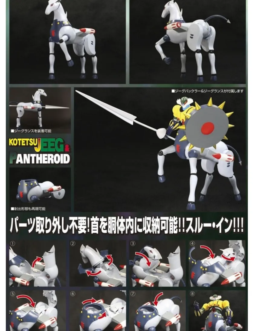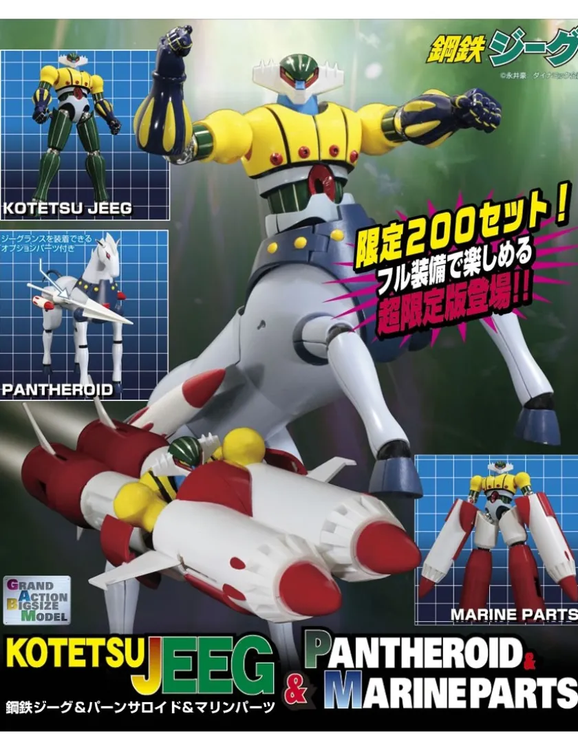 Jeeg Robot d’Acciaio torna nella line-up Future Quest Evolution Toy GRAND ACTION BIG SIZE MODEL con questo set Limited Edition che include Pantheroid (Antares) e le Marine Parts. Il set viene fornito con Mach Drill, Jeeg Bazooka, mini figure di Hiroshi Cyborg (vecchio), mini figure di Hiroshi Cyborg (nuovo), Jeeg Lance e Jeeg Buckler.