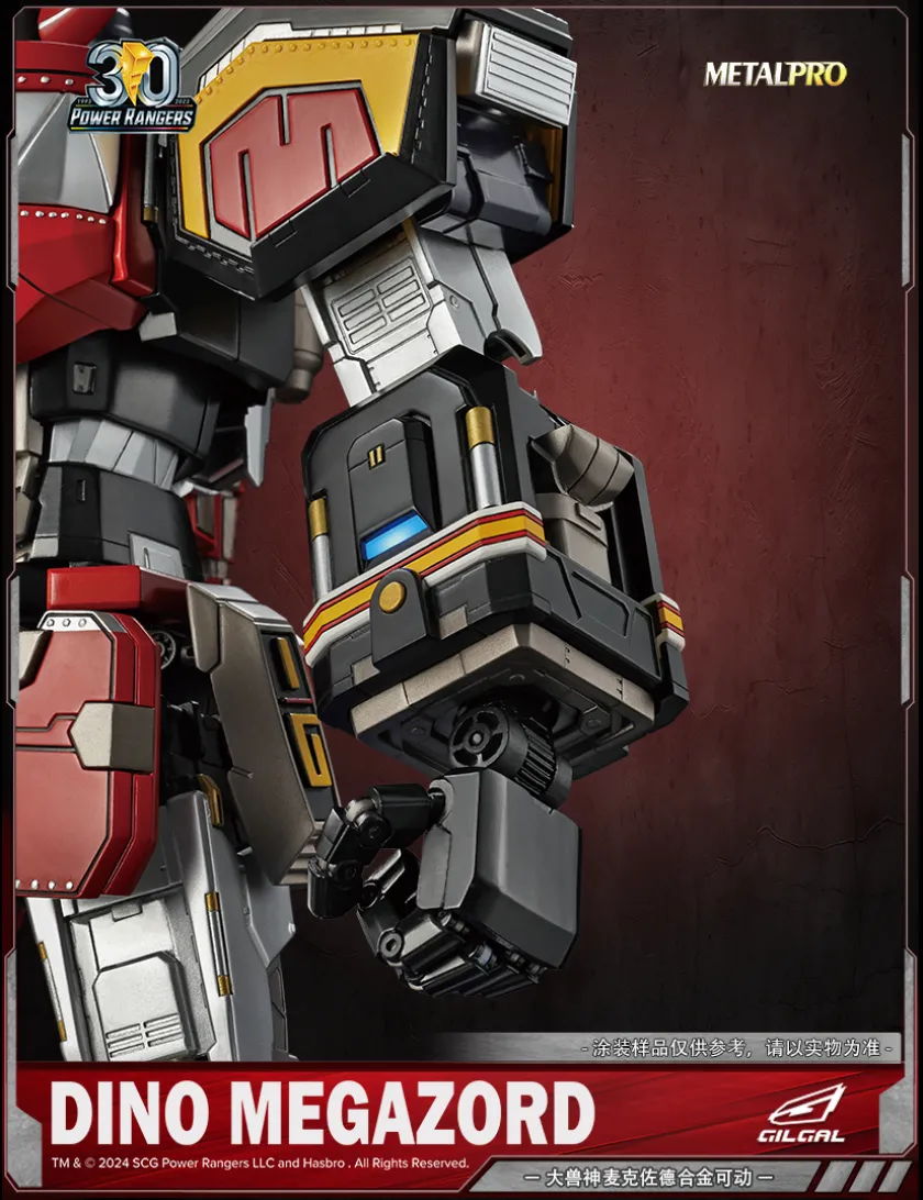 Dino Megazord tratto da Mighty Morphin Power Rangers entra nella line-up Gilgal Toys Metal pro, azione completa, realizzato in plastica e metallo die-cast é alto 50cm. Viene fornito con base espositiva, 4 mani intercambiabili, spada, scudo, mini figure dei 5 Power Rangers e base espositiva per questi ultimi