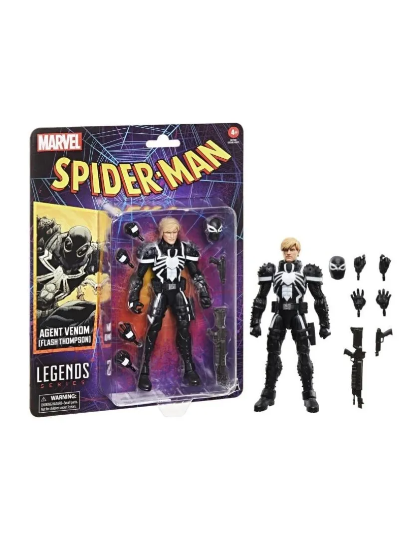 Hasbro Marvel Legends Retro Collection Agent Venom Flash Thompson, azione completa alto 15cm. Viene fornito con 2 teste intercambiabili, 4 mani intercambiabili, fucile e pistola