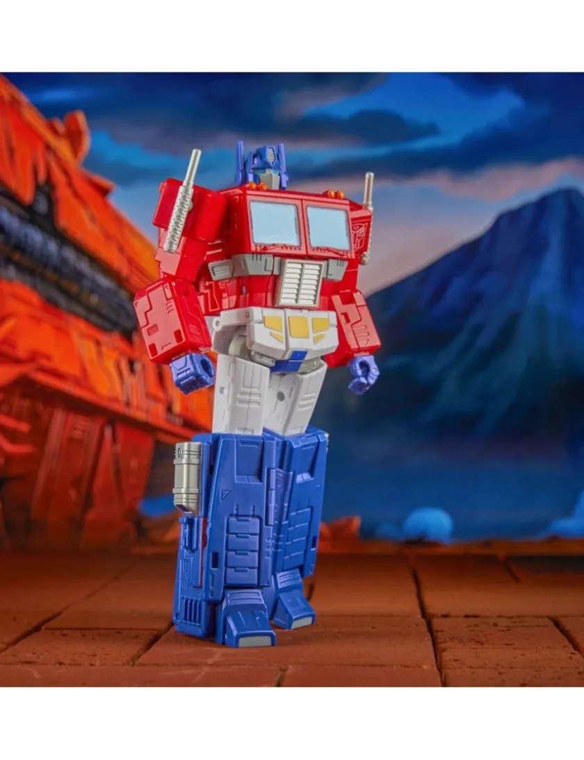 Hasbro Transformers Studio Series 86-31 Commander Class Optimus Prime, azione completa e trasformabile é alto 18cm in modalità robot. Viene fornito con ascia Energon, Ion blaster con parti di effetto, Trailer, Matrice del Potere, parti di effetto esplosione, drone di riparazione Roller e Autolauncher