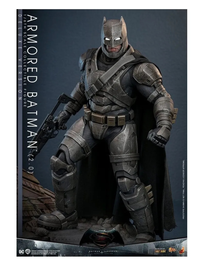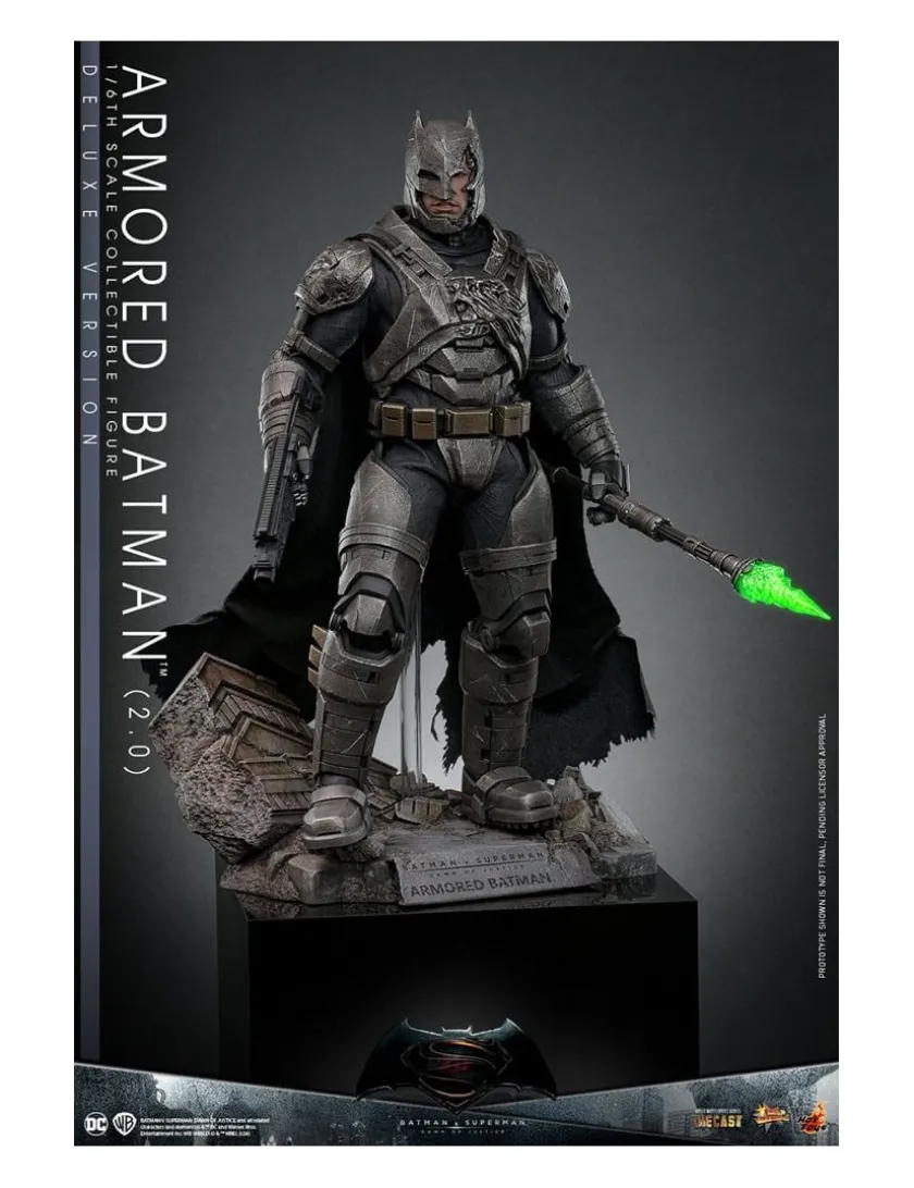 Armored Batman (2.0) Deluxe Version tratto da Batman v Superman Dawn of Justice entra nella line-up Hot Toys Movie Masterpiece, azione completa alto 33cm. Viene fornito con base espositiva diorma, 3 bocche intercambiabili, 7 mani intercambiabili, rampino, pistola alla Kryptonite, casco danneggiato, parti della corazza danneggiata e lancia di Kryptonite
