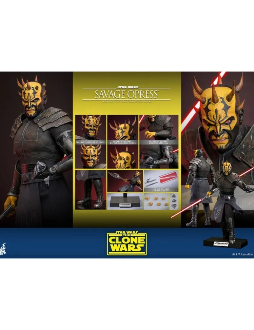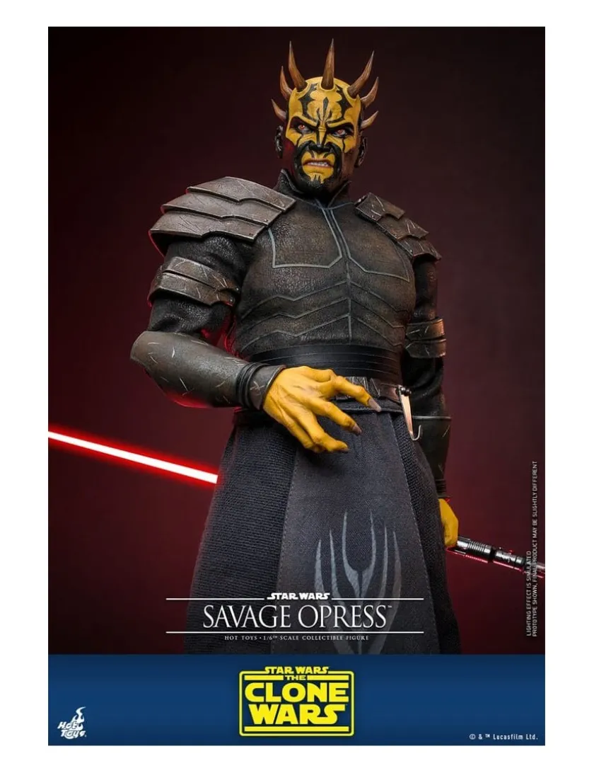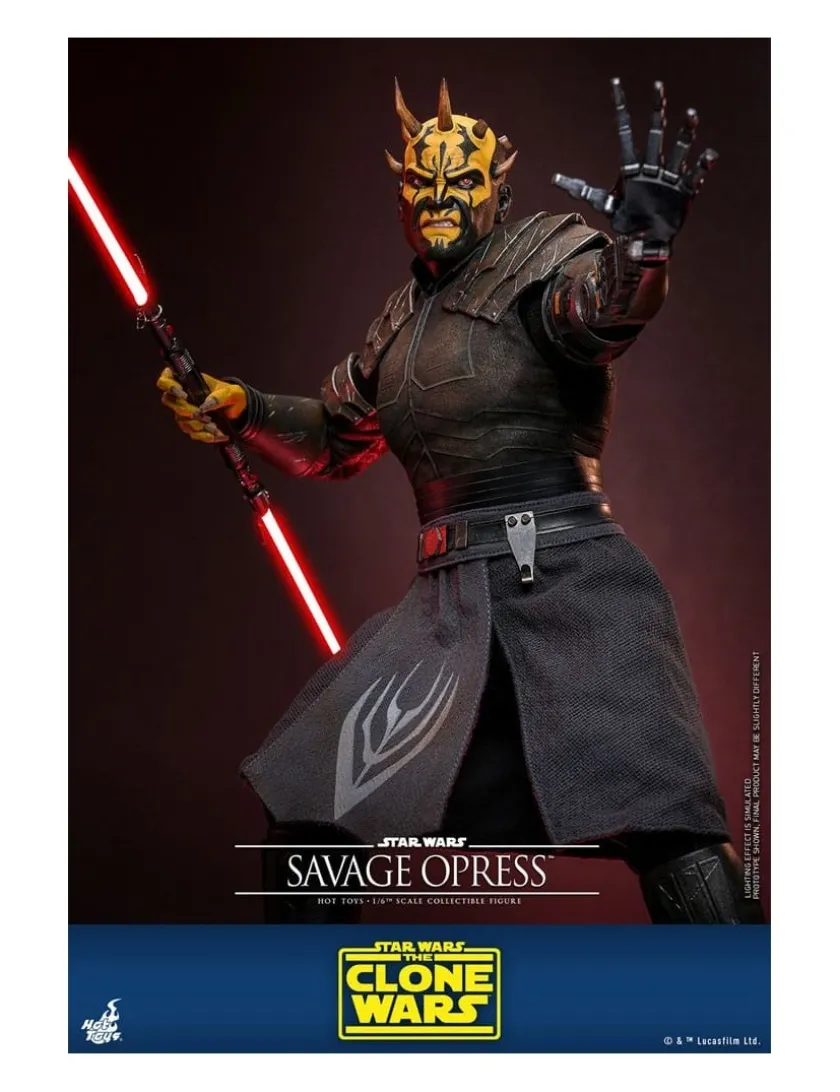 La figura altamente dettagliata è realizzata in base all’aspetto di Savage Opress in Star Wars: The Clone Wars, con una testa scolpita con un sistema di bulbi oculari rotanti separato e corna intercambiabili per creare un aspetto di danno da battaglia, un corpo di nuova concezione, un costume corazzato meticolosamente su misura, una spada laser con luci a LED, lame di spada laser intercambiabili che emulano l’arma in movimento, la sua lancia distintiva, un braccio sinistro mechno intercambiabile con mani intercambiabili e un supporto per la figura appositamente progettato.