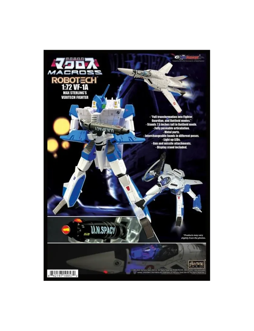 VF-1A Max Sterling Veritech Fighter tratta da Macross entra nella line-up KitzConcept, azione completa e trasformabile in 3 modalità. realizzata in plastica e metallo die-cast é alta 19cm. Viene fornita con base espositiva, mani intercambiabili e armi. Presenta sistema di illuminazione LED.
