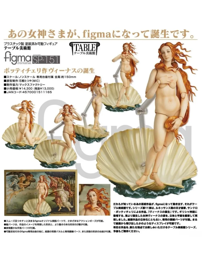 La Nascita della Venere di Botticelli entra nella line-up Max Factory Figma The Table Museum, azione completa alta 15cm. Viene fornita con base espositiva a conchiglia, mani inbtercambiabili, capelli intercambiabili e sfondo