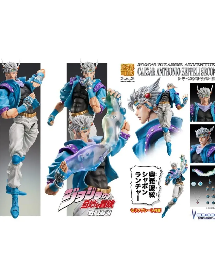Caesar Anthonio Zeppeli tratto da JoJo Bizarre Adventures Battle Tendency torna nella line-up Medicos Super Action Statue, azione completa alto 16cm. Viene fornito con base espositiva, 7 mani intercambiabili, pendente e parti d’effetto