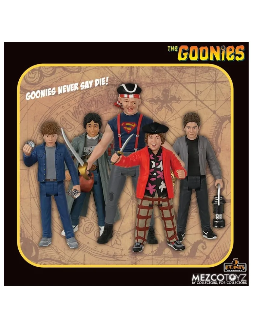 Ricco di avventure fantasiose, battute spiritose e personaggi memorabili, I Goonies รจ un amato classico di culto che ha catturato i cuori di generazioni sin dalla sua uscita nel 1985. Direttamente dal film d’avventura senza tempo, questo set include 5 membri dei Goonies: Mikey, Chunk, Data, Mouth e Sloth, ciascuno con una base espositiva nera e i propri accessori unici.