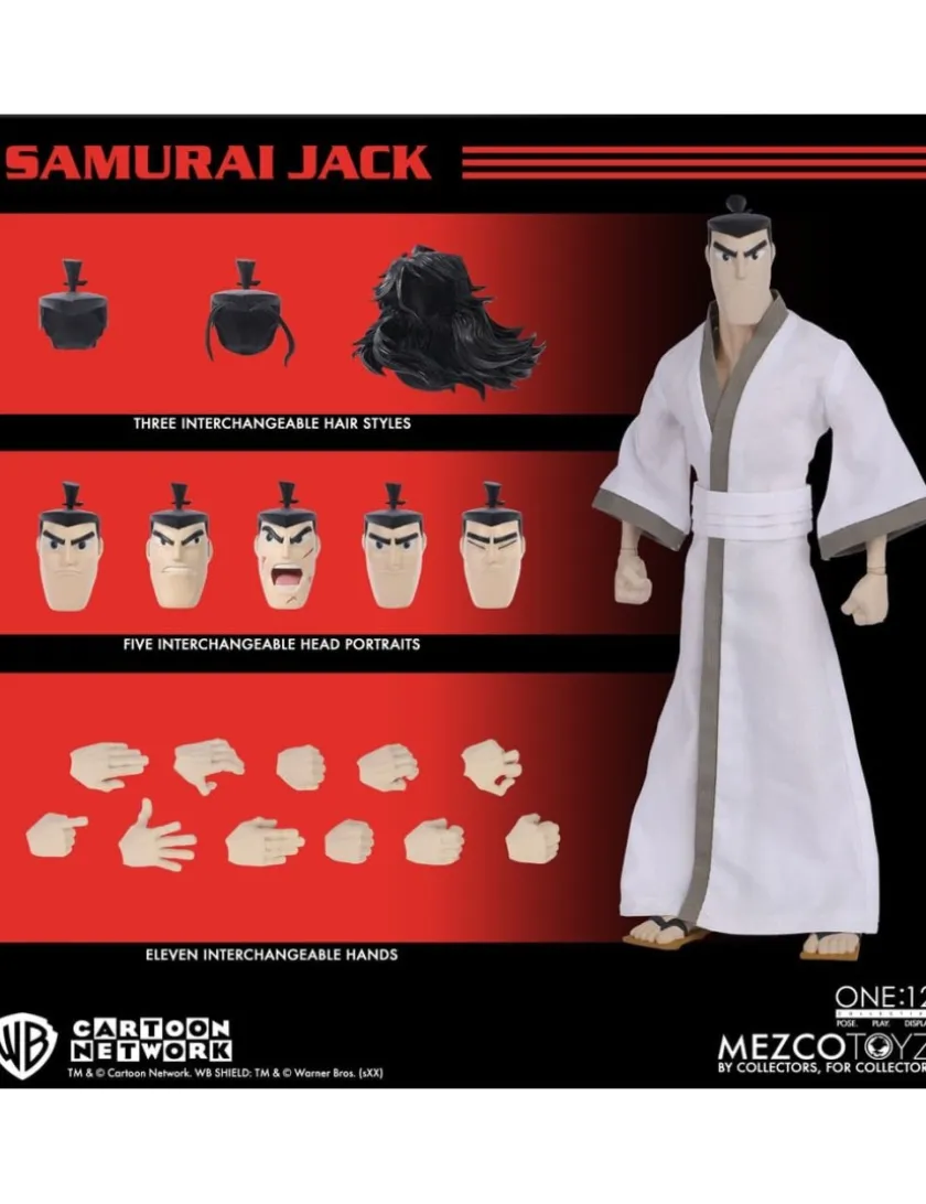 Samurai Jack di One:12 Collective รจ vestito con il suo iconico gi bianco, sandali geta, un cappello rimovibile e una benda rimovibile. 5 ritratti di testa con 3 acconciature intercambiabili consentono una moltitudine di look distinti e possibilitร di posa.