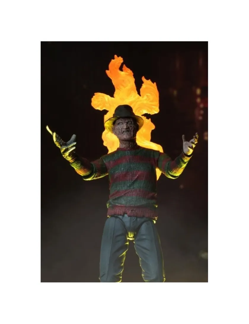 Ultimate Part 2 Freddy presenta molti dettagli raccapriccianti e tantissimi accessori, tra cui 3 teste intercambiabili, 2 cani, mano con guanto, mano mostruosa e cappello rimovibile. C’è anche un effetto fuoco attaccabile tratta dalla scena della piscina! La figura alta 18cm è altamente articolata.