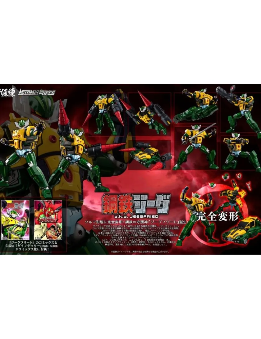 Koutetsu Jeeg Jeegfried é la nuova entrata nella line-up Sentinel Metamor-Force. Azione completa alto 20cm, realizzato in ABS, PVC e metallo die-cast. Trasformabile. Viene fornito con mani intercambiabili, 2 Jeeg Bazooka, 2 Mach Drill, Holy Sword Balmug, parti per Knuckle Bomber e fumetto Dino Getter & Jeegfried