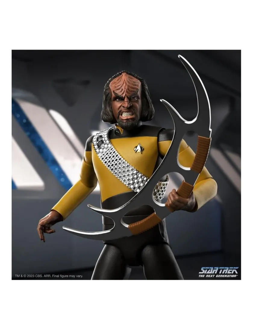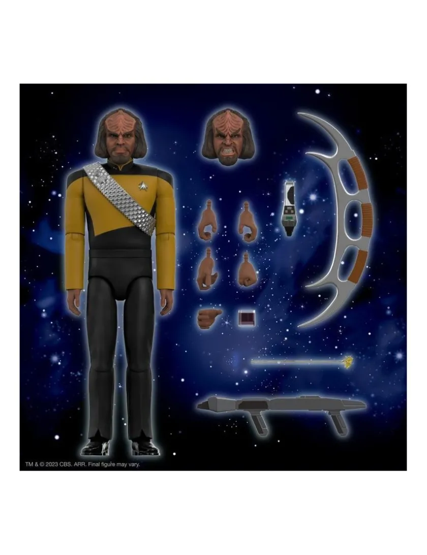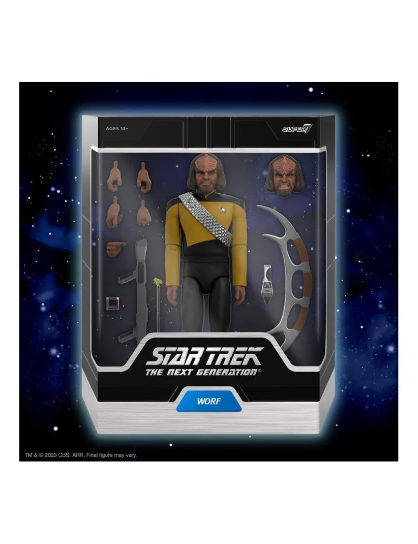 Worf tratto da Star Trek The Next Generation entra nella line-up Super7 Ultimates!, azione completa alto 18cm. Viene fornito con 2 teste intercambiabili, 7 mani intercambiabili, armi e accessori
