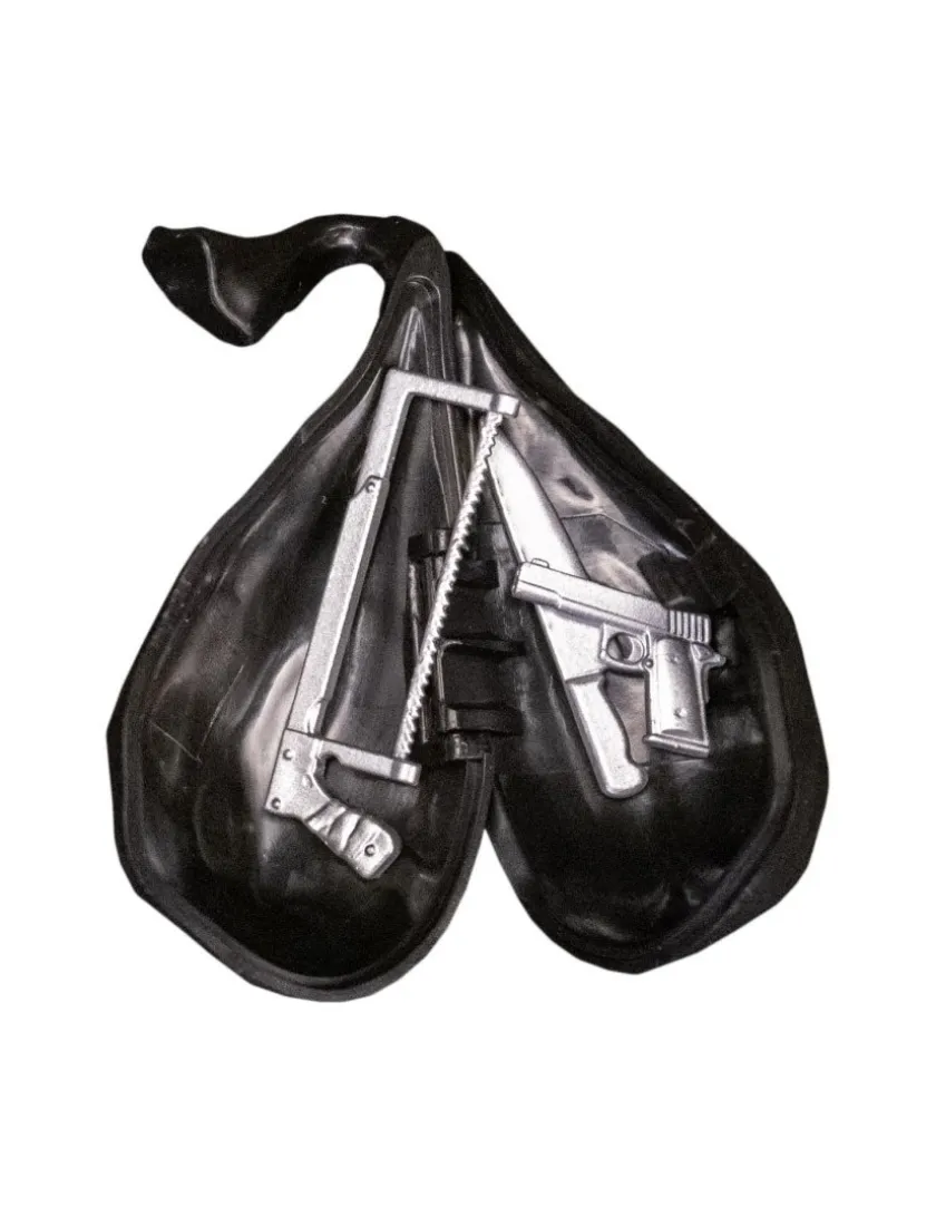 La figura arriva in blister ed include l’iconico sacco della spazzatura contiene sega,pistola e coltello.